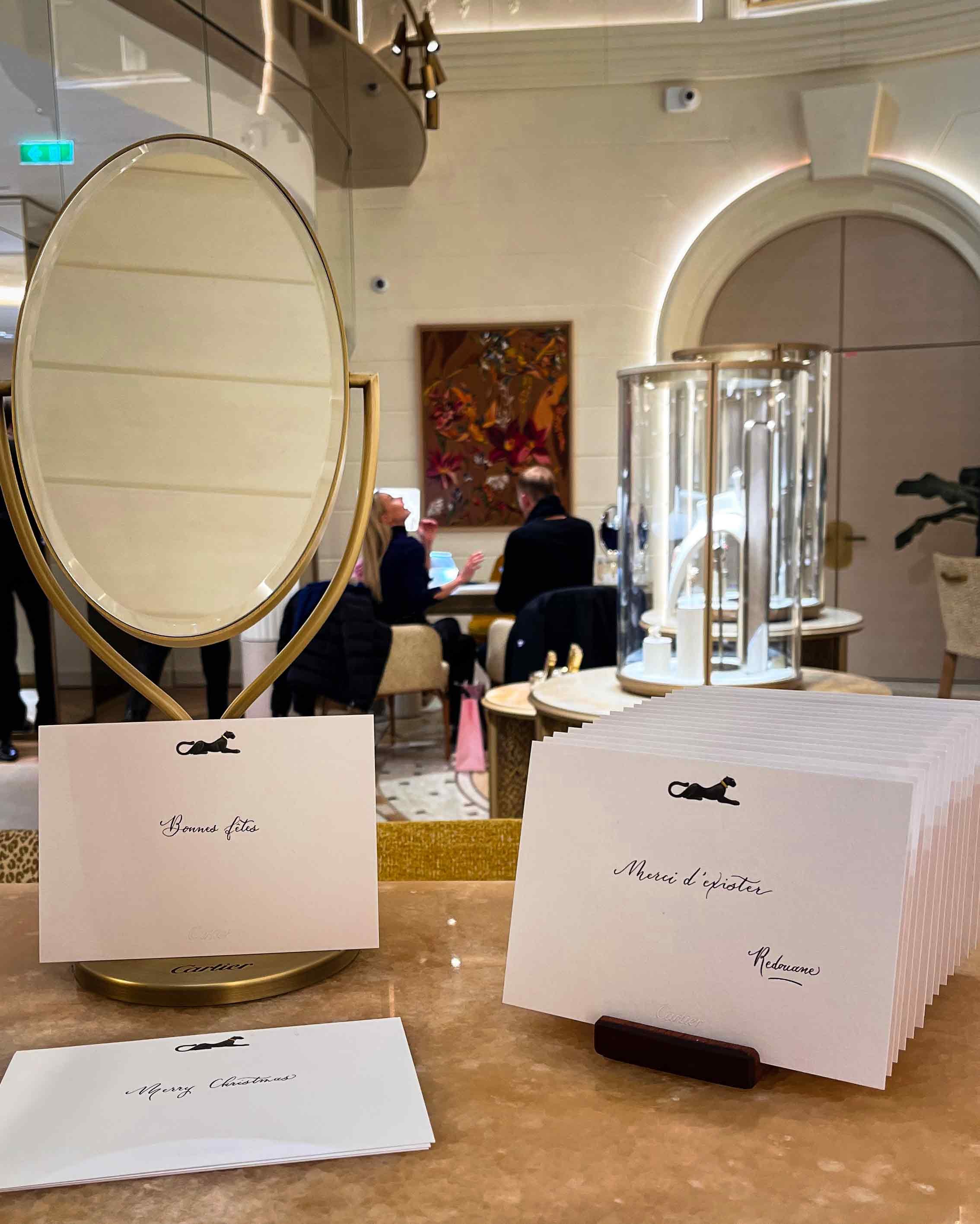 Calligraphy of names or custom messages for Christmas and New Year’s wishes on Cartier cards.