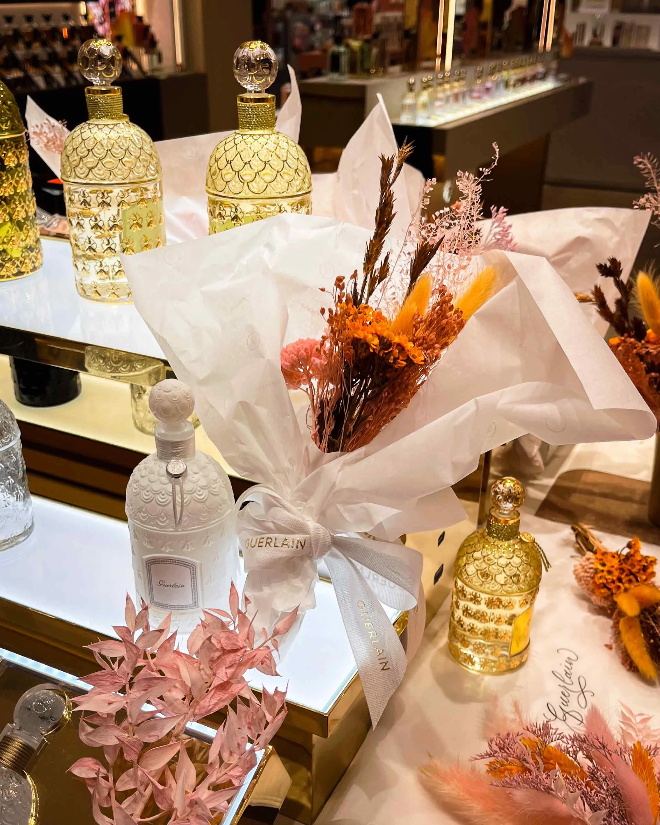 Workshop in-store offering the crafting of dried flower bouquets for Mother's Day alongside personalized message calligraphy on tissue paper..
