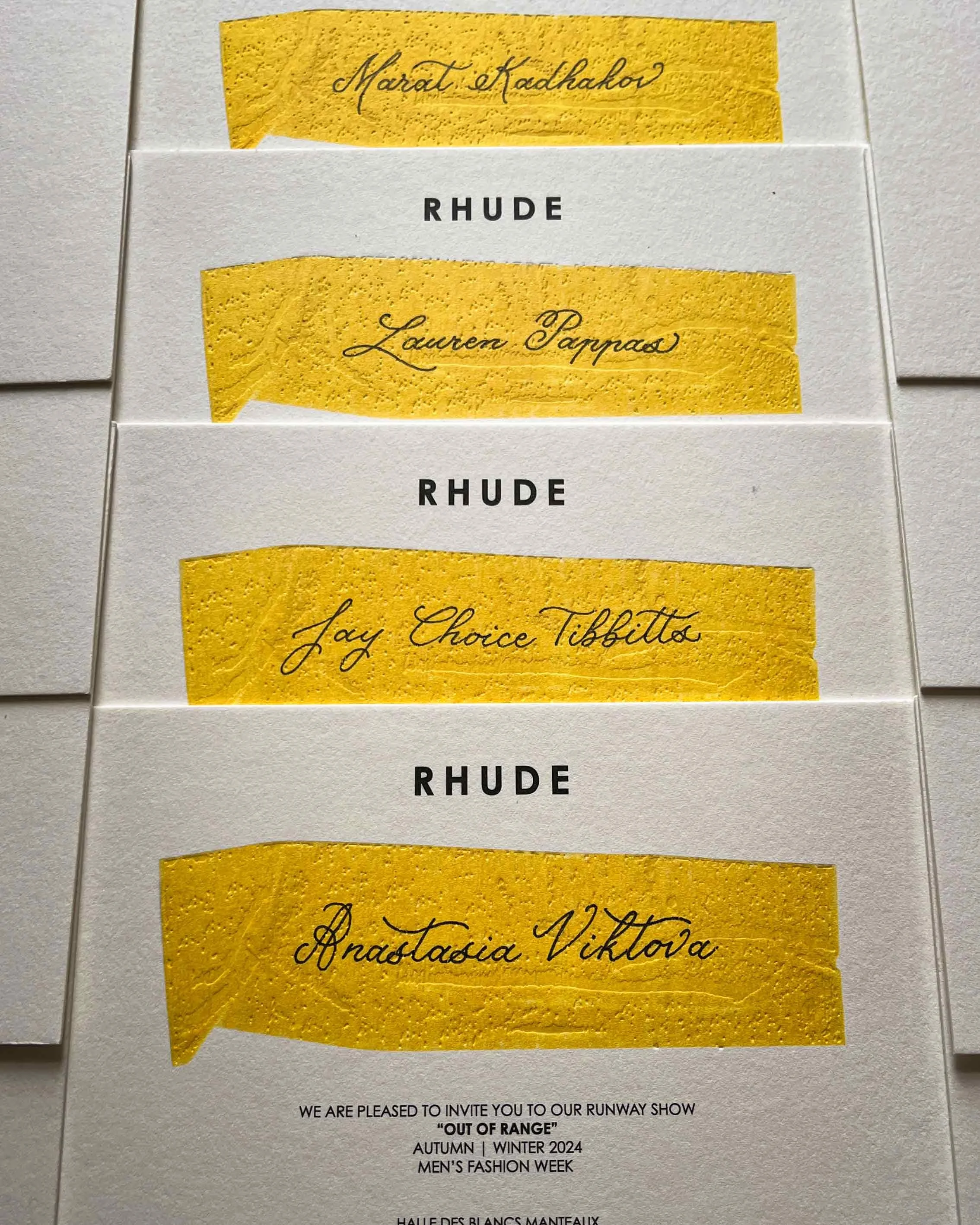 Calligraphie de noms et prénoms en style moderne pour s’accorder avec le design de l’invitation dans le cadre du défilé de mode de la marque Rhude pour la présentation de la collection Automne/Hiver 2024
