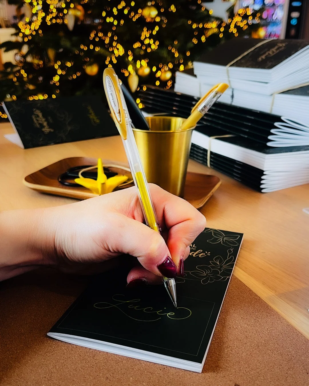 For the 2025 holiday season, L’Oréal Luxe’s Campus 62 in Levallois-Perret wanted to offer its employees a meaningful and personalized gift: a gratitude journal hand-lettered with each person’s first name. Studio Calliphanie worked alongside a second calligrapher to personalize 400 notebooks in a single day, ensuring a smooth experience with minimal waiting time and enough space for a genuine moment of exchange with each collaborator. This type of corporate activation gives real meaning to employee appreciation : a handcrafted, personalized gift speaks to individual attention in a way that no off-the-shelf present can.