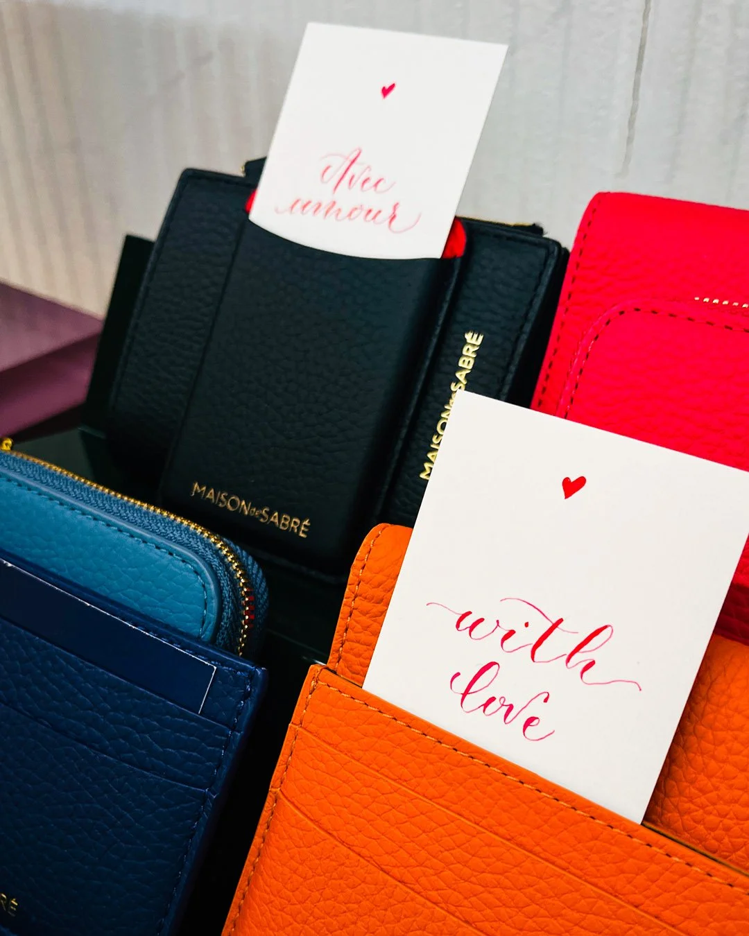 Pour la Saint-Valentin 2026, Maison de Sabré animé son corner au Bon Marché Rive Gauche avec une expérience de calligraphie live pensée autour de l’amour et de la maroquinerie. Des messages d’amour, des prénoms et des mots tendres ont été calligraphiés sur des cartes personnalisées pour chaque cliente. Entre les personnalisations, des illustrations et compositions calligraphiques sur le thème de l’amour ont été réalisées en direct, renforçant l’atmosphère de l’activation et la visibilité du corner. Ce type d’animation transforme un espace de vente en destination : les clients s’arrêtent, observent, et vivent une expérience qu’ils n’oublieront pas.